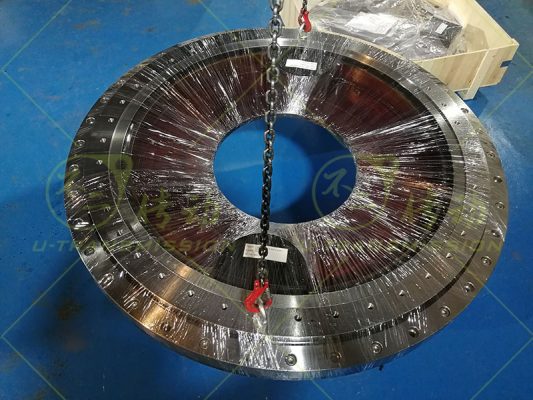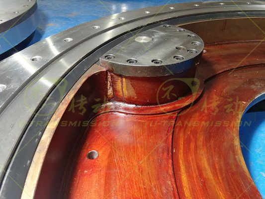 S-III-I-1300-2內(nèi)齒雙驅(qū)齒輪式回轉(zhuǎn)驅(qū)動使用在自動化設(shè)備上,客戶的設(shè)備外部空間受限,部件需要盡量安裝在齒輪式回轉(zhuǎn)驅(qū)動的內(nèi)部,設(shè)備底部有足夠的安裝空間,設(shè)備運(yùn)轉(zhuǎn)需要大輸出扭矩,設(shè)備轉(zhuǎn)速低,需要大的總減速比。綜合上述客戶需求,不二傳動為客戶設(shè)計(jì)了內(nèi)齒雙驅(qū)齒輪式回轉(zhuǎn)驅(qū)動,內(nèi)齒傳動,輸入端靠近圓心,可以保證外徑是整圓,減速電機(jī)可以安裝到靠近圓心的位置,不占用外部空間。設(shè)備底部有安裝空間,驅(qū)動的輸入端就設(shè)計(jì)在底面上,方便客戶使用。針對客戶需要大減速比,大扭矩,不二傳動采用了小模數(shù)齒,雙齒輪傳動,小模數(shù)保證大減速比,雙齒輪保證大輸出扭矩。這一設(shè)計(jì)解決了客戶的問題。