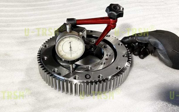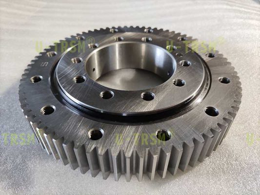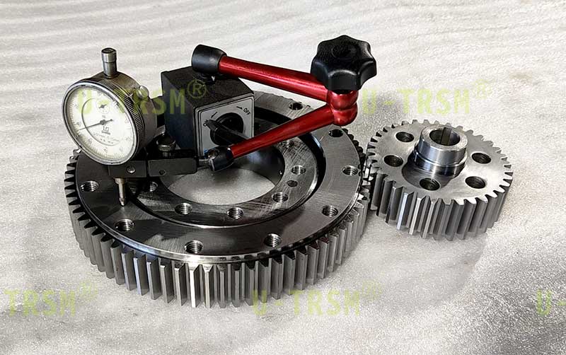 這是型號為011.16.160的精密四點球回轉支承及配套小齒輪,客戶用在自動化設備上。回轉支承和齒輪都要求高精度磨齒,并且回轉支承要求0游隙,端跳和徑跳要小于等于0.02mm,旋轉靈活。最終實測負游隙,旋轉靈活,端跳、徑跳≤0.015mm。齒輪和回轉支承齒圈均達到6級齒精度要求,完全滿足客戶的使用要求。