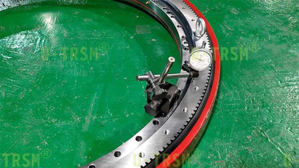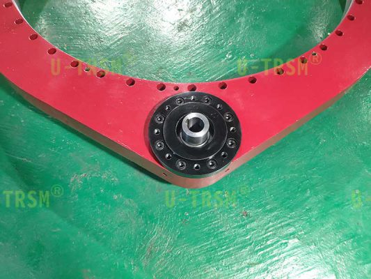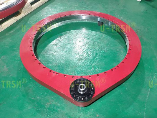 這是一款輕系列的直齒回轉驅動產品,適合客戶低載荷的工況。小模數,在直徑一定的情況下,模數越小齒的數量就越多,小齒輪相同,模數小,減速比就大,大減速比適合客戶的低轉速。回轉中心直徑941mm,滿足了客戶對大尺寸工件穩(wěn)定支承旋轉的需求。