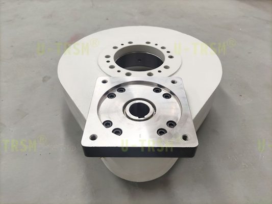 回轉驅動負責帶動四工位工作臺旋轉,到每個工位停止一段時間后,自動旋轉到下一工位,如此循環使用。工作臺旋轉的時候有較大的偏載,需要大的扭矩才能順利轉動工作臺。
