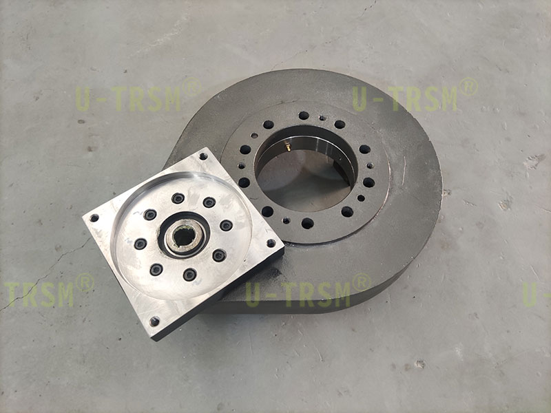 根據客戶的要求我們設計了這款回轉驅動,回轉驅動的安裝尺寸按照客戶要求定制,輸入端適配客戶的普通減速電機,普通減速電機的輸出法蘭尺寸一般都比較大,設計適配法蘭的時候需要注意不能干涉回轉驅動內圈安裝螺栓。