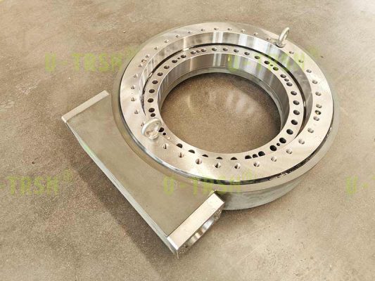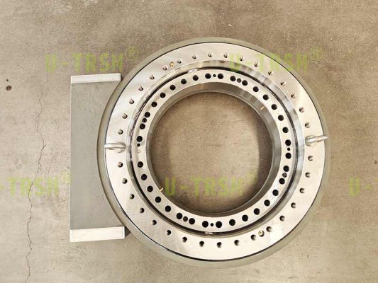 不二傳動(dòng)設(shè)備(洛陽)有限公司給客戶設(shè)計(jì)了一款大模數(shù),大扭矩,豎直安裝使用的蝸輪蝸桿式回轉(zhuǎn)驅(qū)動(dòng)。該回轉(zhuǎn)驅(qū)動(dòng)用在大型自動(dòng)化設(shè)備上,豎直安裝使用,載荷較大,并伴隨很大的傾覆力矩,回程旋轉(zhuǎn)時(shí)要求穩(wěn)定平順。經(jīng)過與客戶的多次溝通,不二傳動(dòng)的設(shè)計(jì)師根據(jù)客戶工況,推薦使用蝸輪蝸桿式回轉(zhuǎn)驅(qū)動(dòng),并使用大模數(shù)來增加回轉(zhuǎn)驅(qū)動(dòng)的扭矩,根據(jù)齒承載及力學(xué)性能分析,輸出扭矩可達(dá)近200KNm。