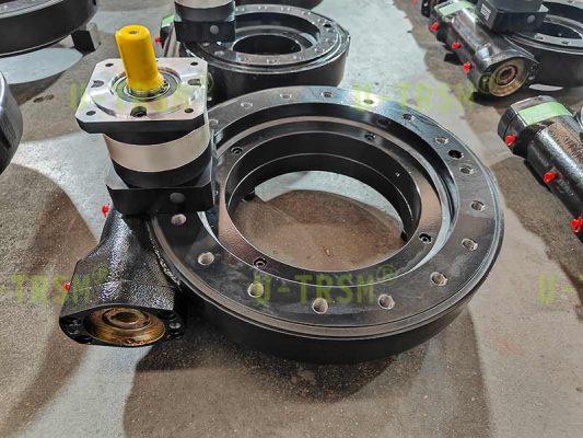 精密14寸回轉驅動配套行星減速機應用在特重設備上,使用特點是轉速特別低,需要大的減速比,輸出扭矩要求小,要求精度較高,并且底座和轉臺外側都沒有空間安裝減速機和電機,電機和減速機只能安裝在底座和轉臺中間的夾縫中。